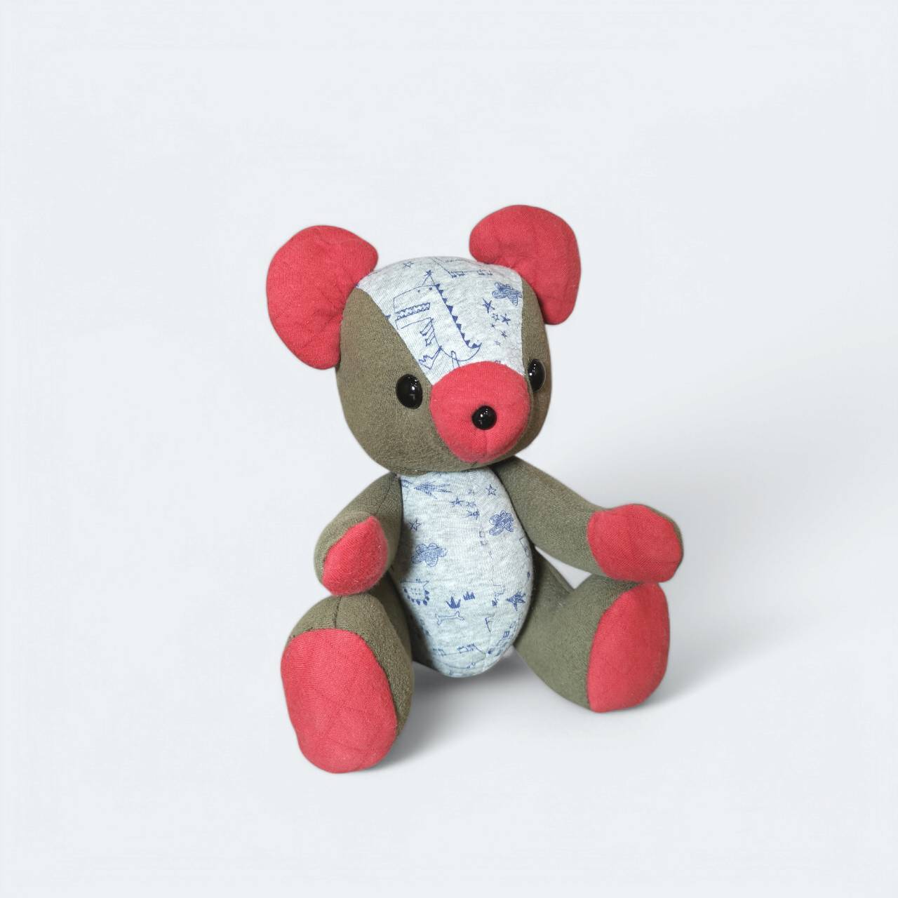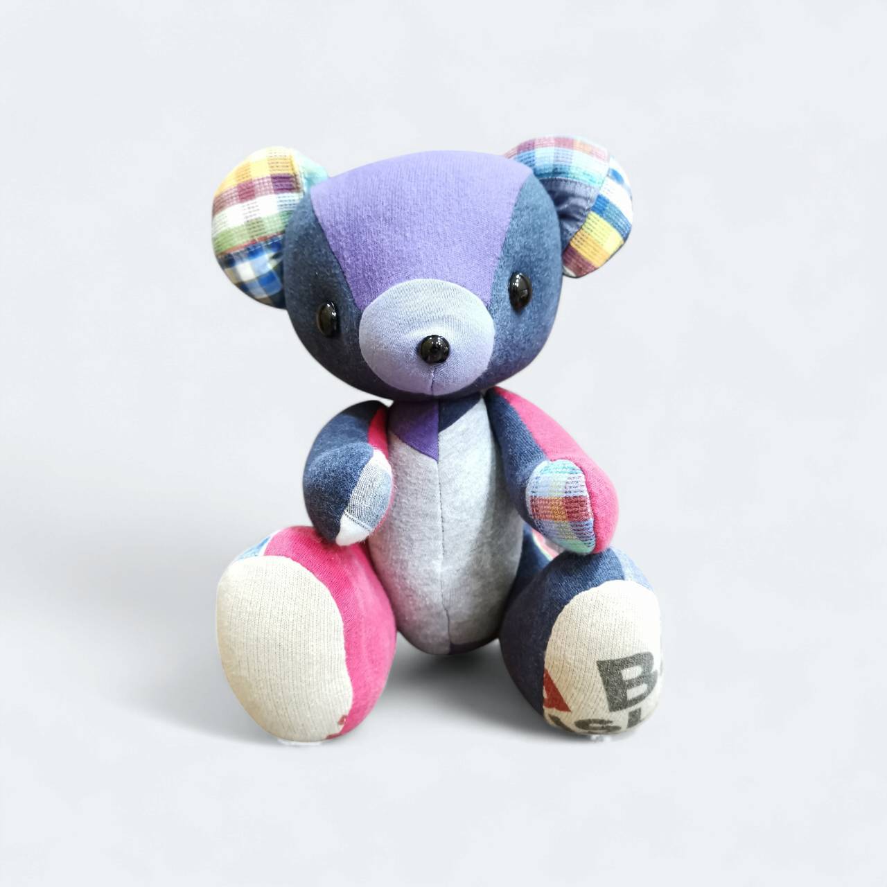 ◇テディベアの体には、綿と一緒にお送りいただいた子ども服の一部を細かく加工して詰めています。これにより、見た目だけでなく、内側にも思い出が詰まった特別な仕上がりになります。